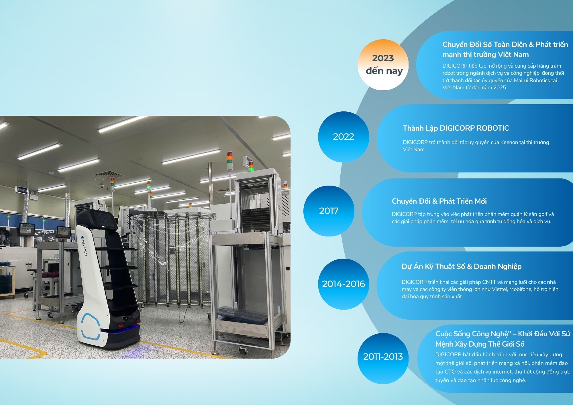 Công ty Cổ phần Digicorp tiên phong cung cấp giải pháp tự động hóa bằng robot tại Việt Nam. Chúng tôi hỗ trợ doanh nghiệp từ khảo sát, thiết kế giải pháp đến triển khai hệ thống robot giao nhận, nâng hạ, kết nối băng chuyền và phục vụ nhà hàng, khách sạn, giúp tối ưu hóa vận hành nhà máy, kho hàng và nâng cao trải nghiệm khách hàng. Robot Digicorp hoạt động bền bỉ, chính xác, tiết kiệm chi phí và tăng năng suất.